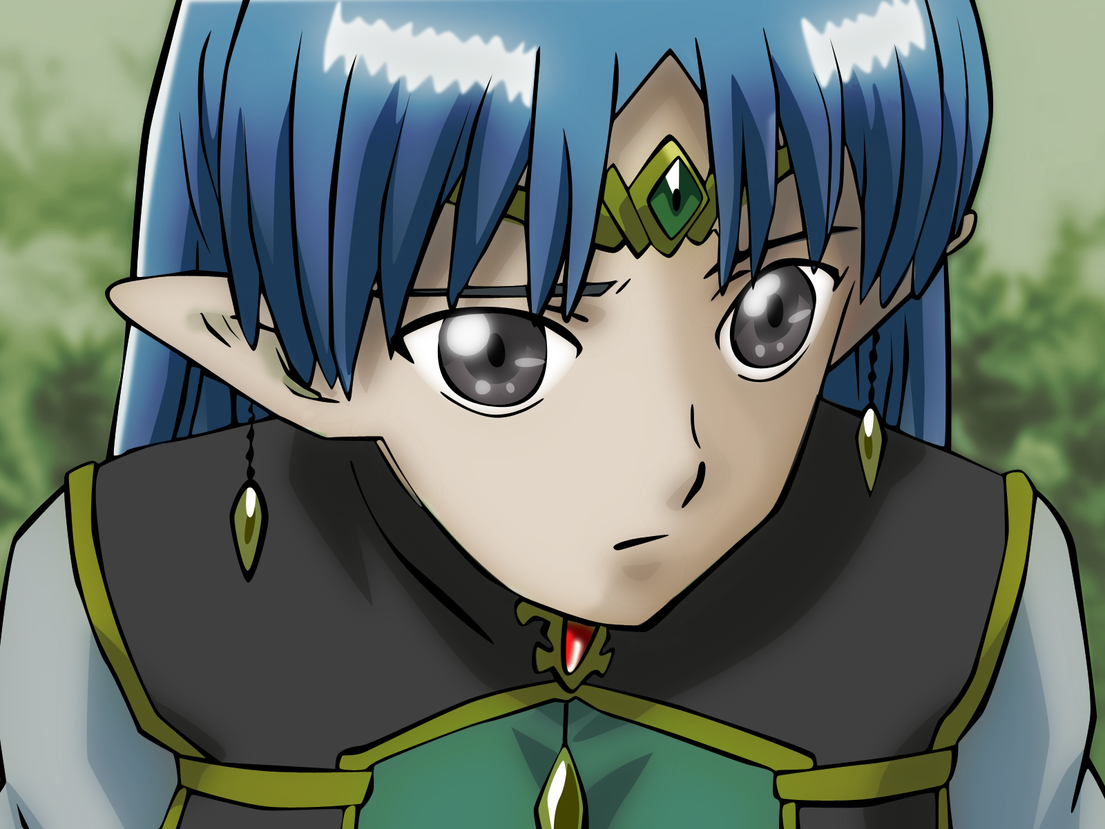 Description: A cartoon character with blue hair and green eyes wearing a black outfit and green and blue hair and green eyes.