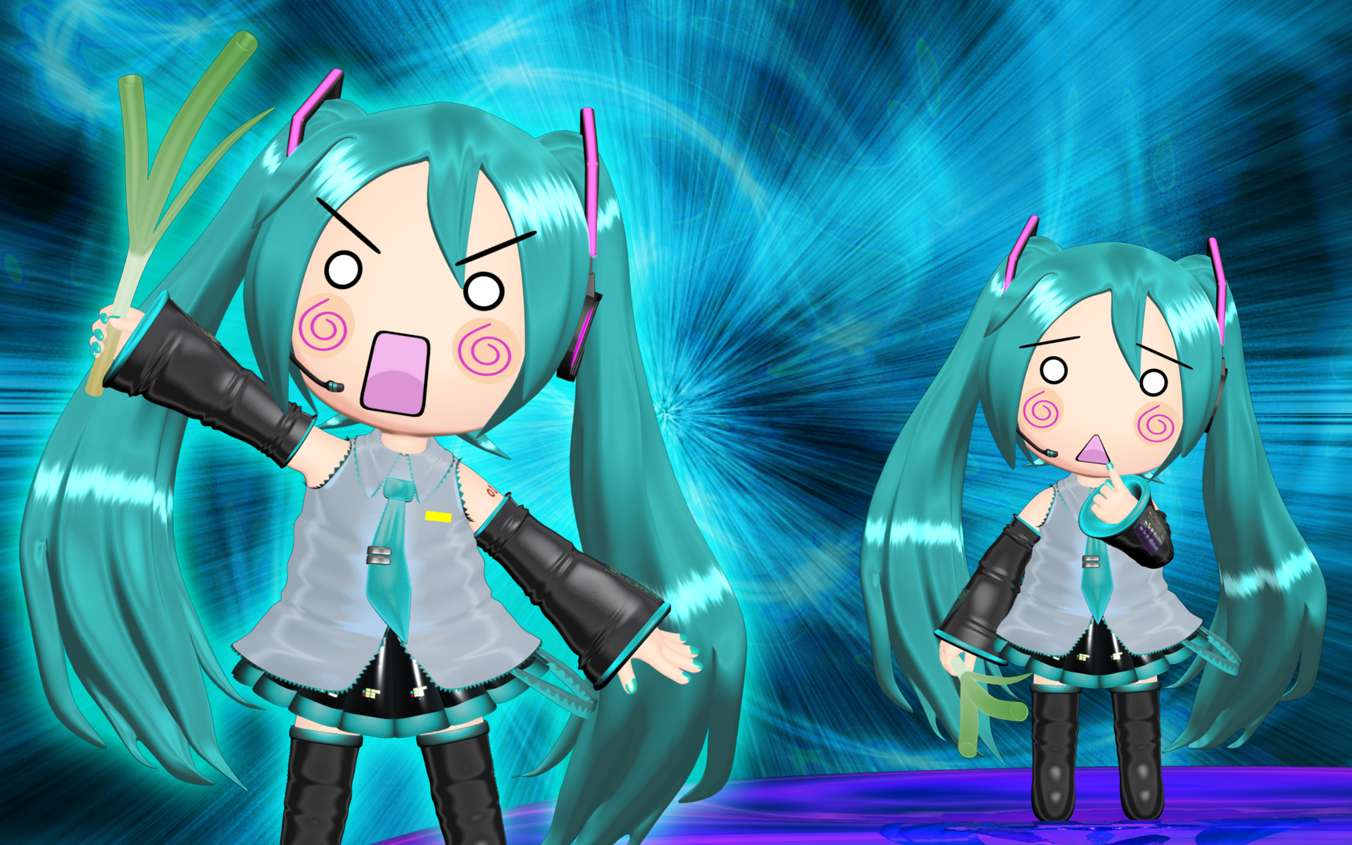 Description: A cartoon character with long hair and a blue wig holding a gun and pointing at something in the air.