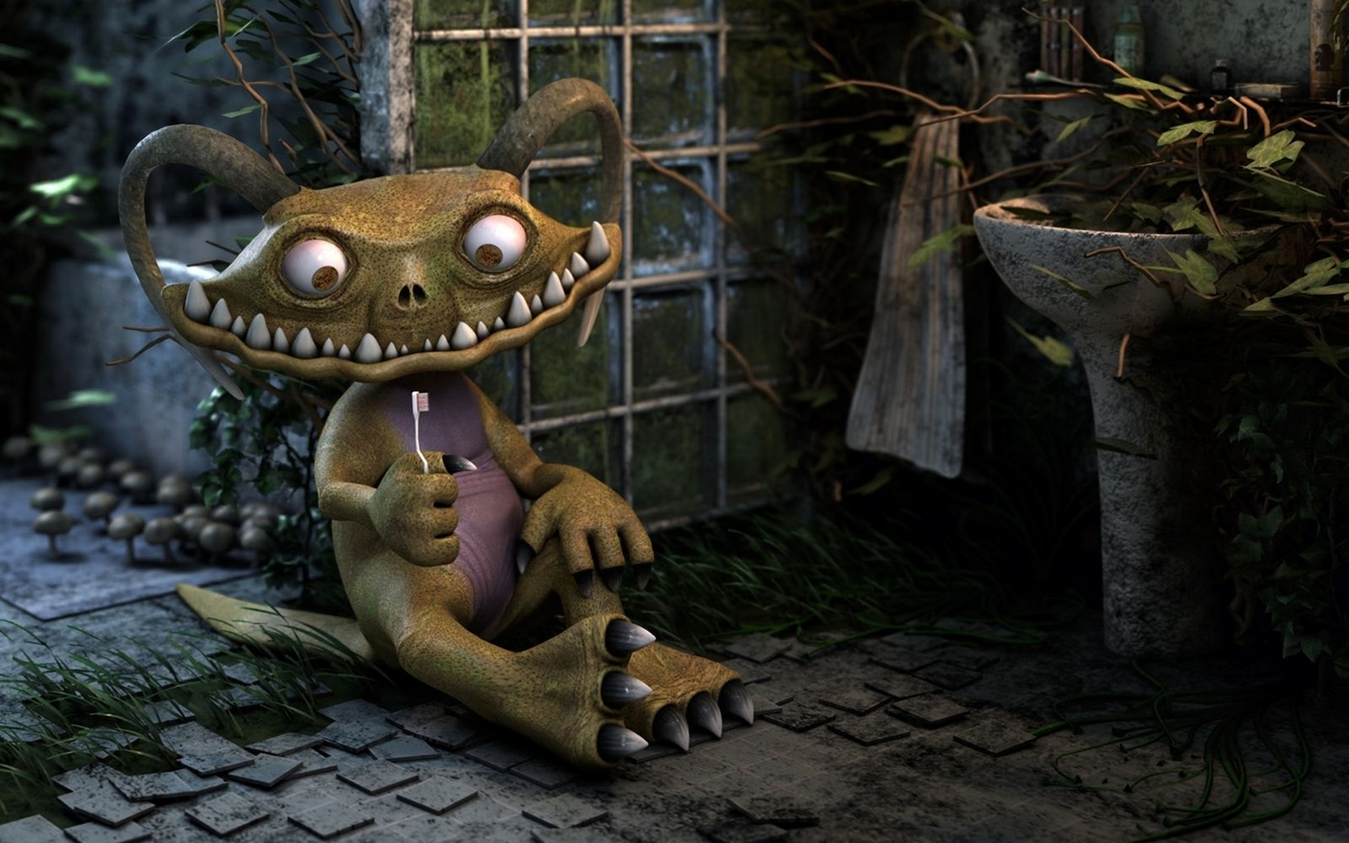 Description: A cartoon character sitting on a brick floor next to a window with a plant growing on it's side.