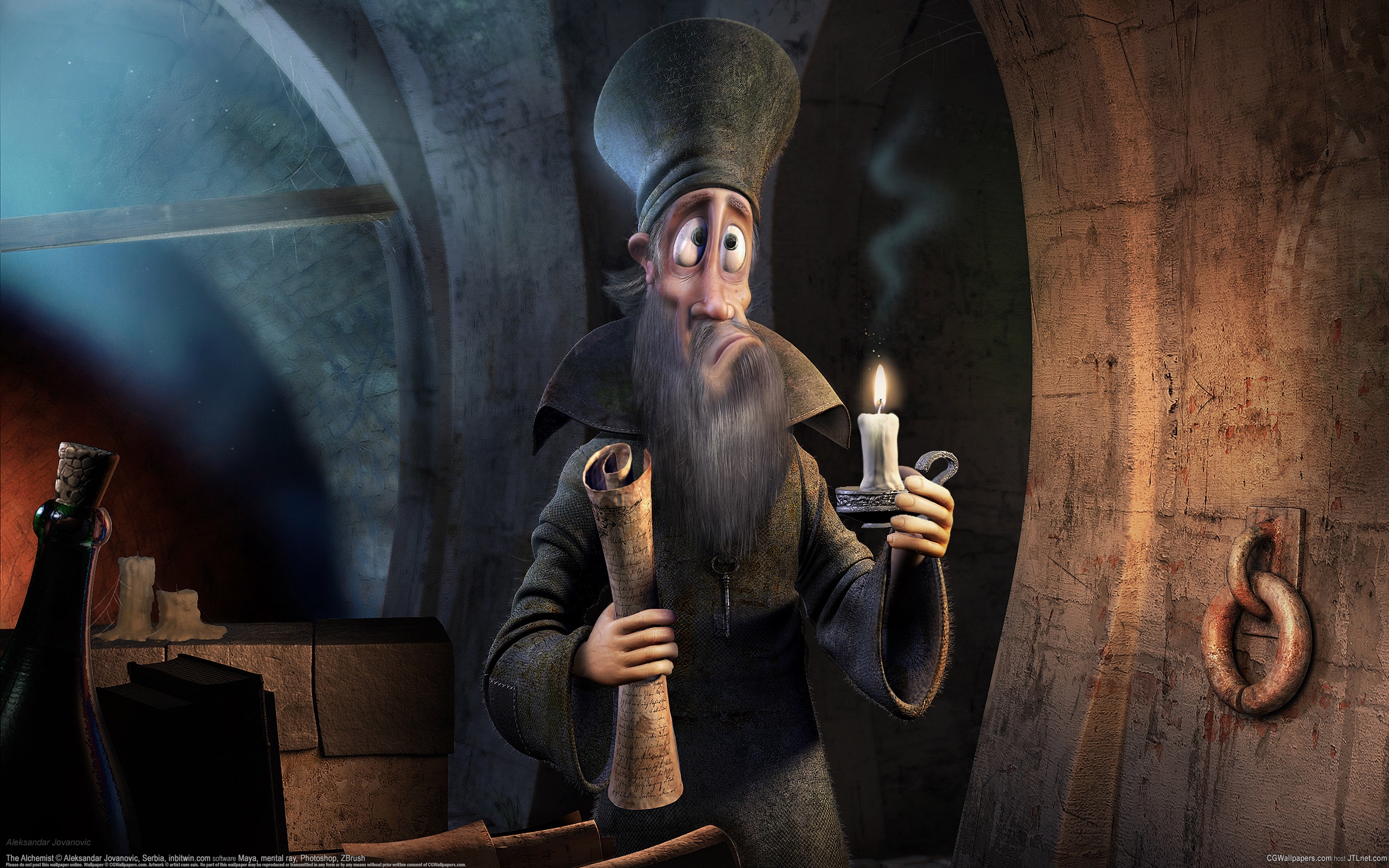 Description: A cartoon character holding a candle in a room with a stone wall and a door in the background.