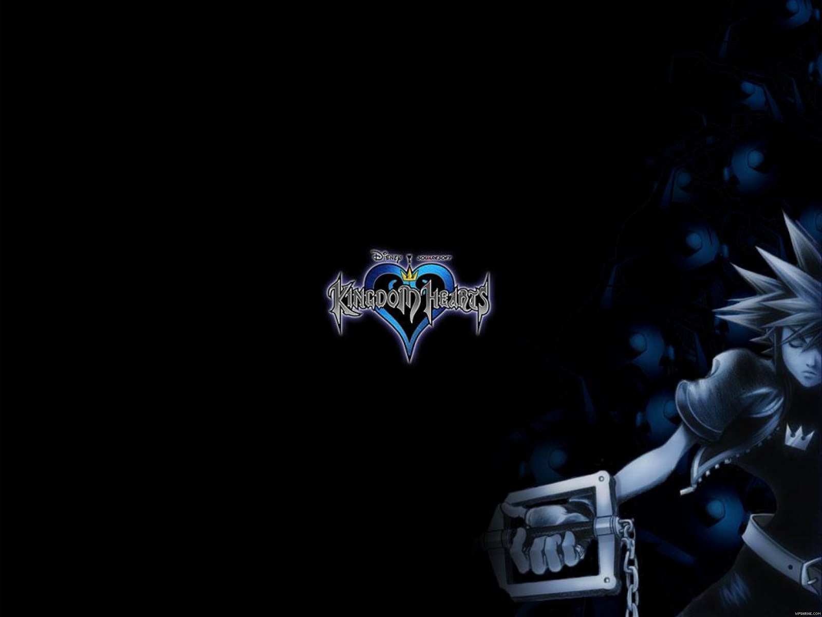 Description: A cartoon character holding a chain with a heart on it's chest and a black background with blue hearts.