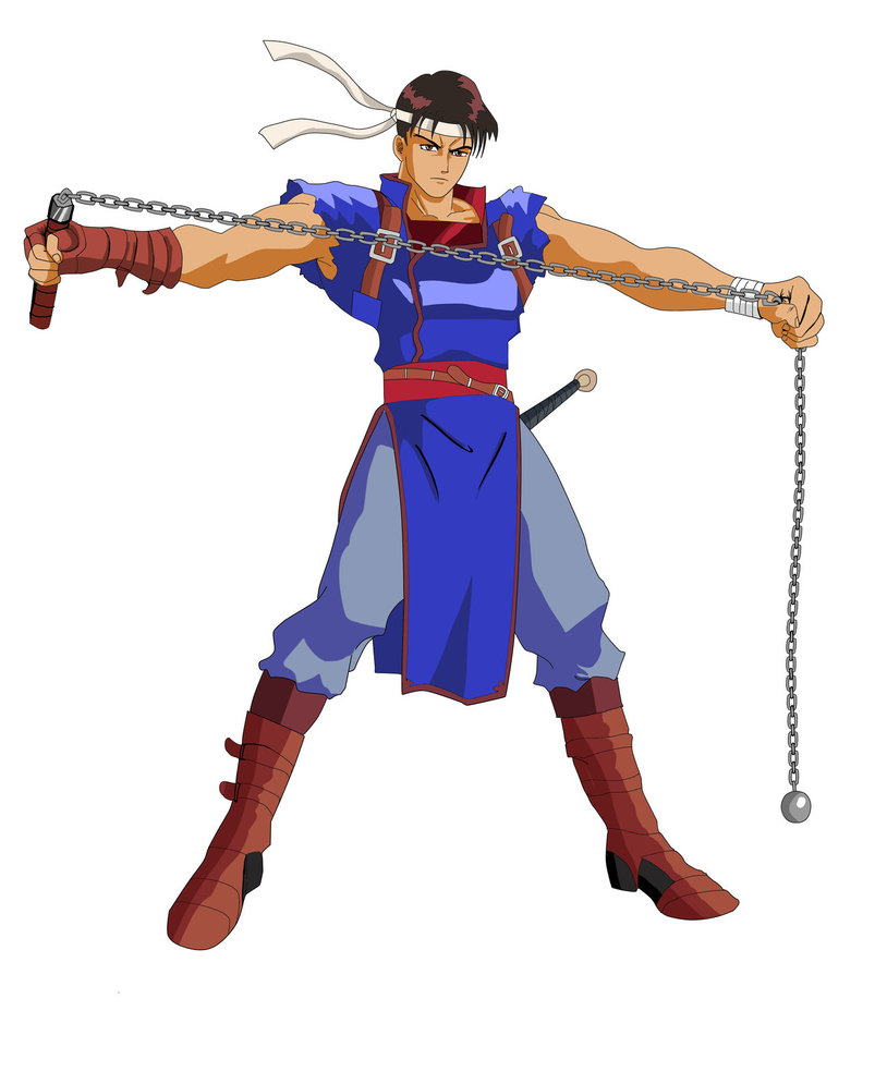 Description: A cartoon character holding a chain and a sword with both hands and a sword in his other hand.