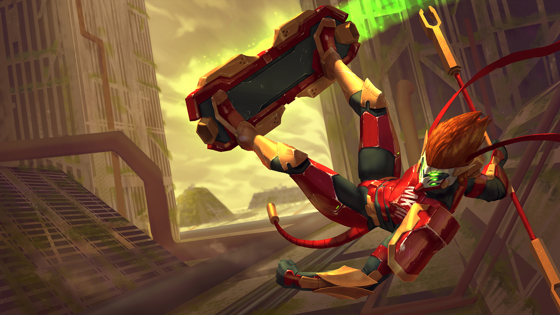 Description: A cartoon character is holding a large object in a city setting with a green light above her head and a red and yellow outfit.