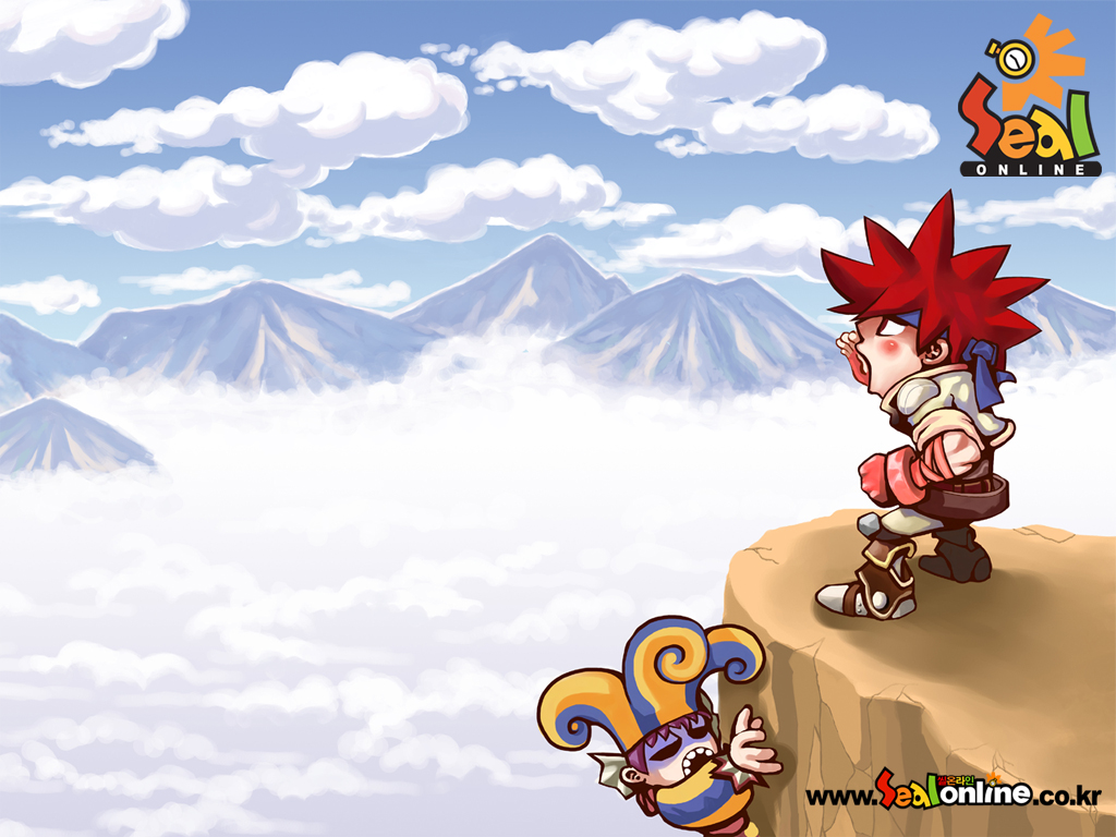 Description: A cartoon character is standing on a cliff above the clouds and mountains with a guitar in his hand and a guitar in his other hand.