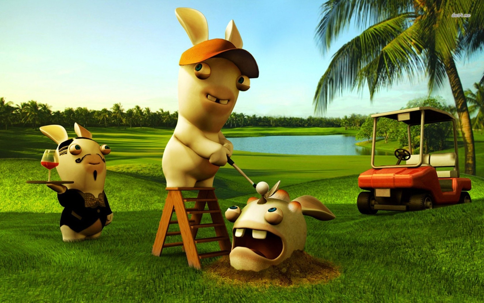 Description: A cartoon character is playing with a cow and a cow in a field with a golf cart and a golf player.