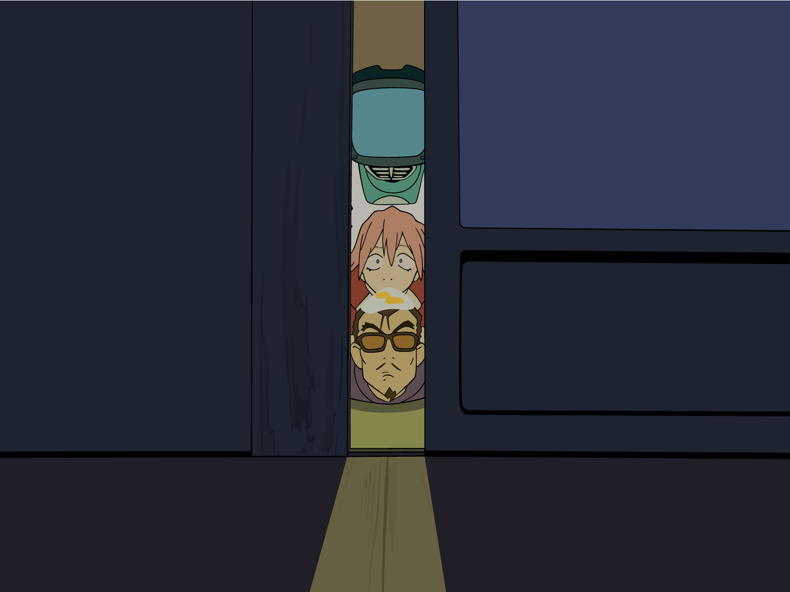 Description: A cartoon character is looking out of a doorway at another character in the background with a cat in the doorway.