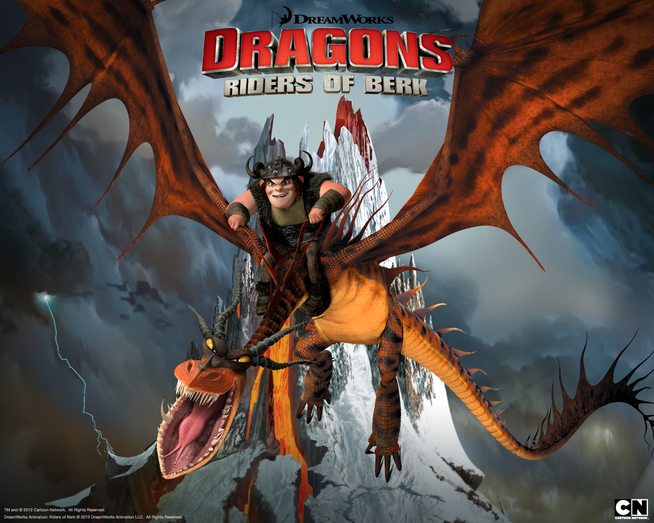 Description: A cartoon character riding a dragon with a sword in his hand and a mountain in the background with clouds.