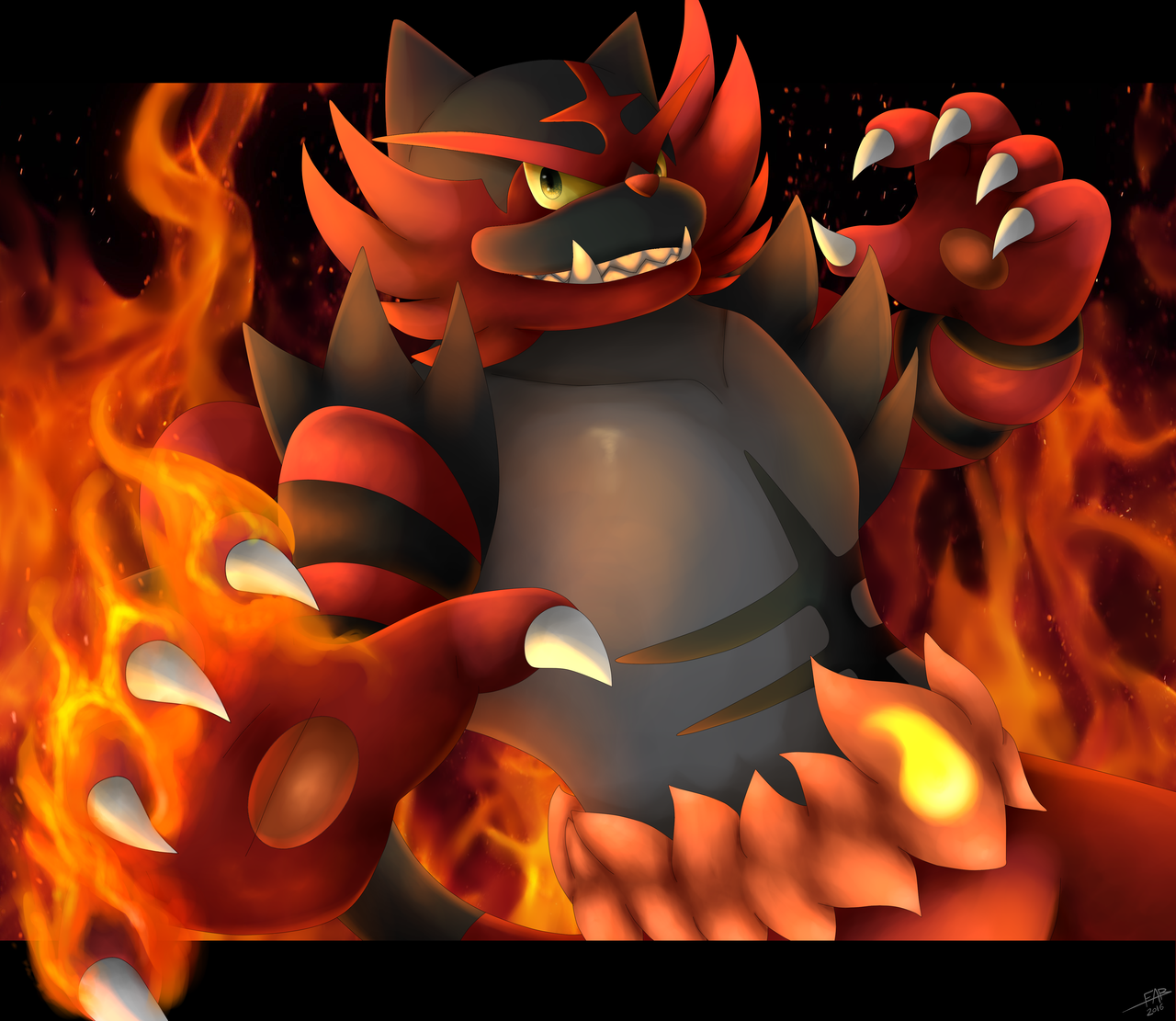 Description: A cartoon character with a fire breathing face and arms.