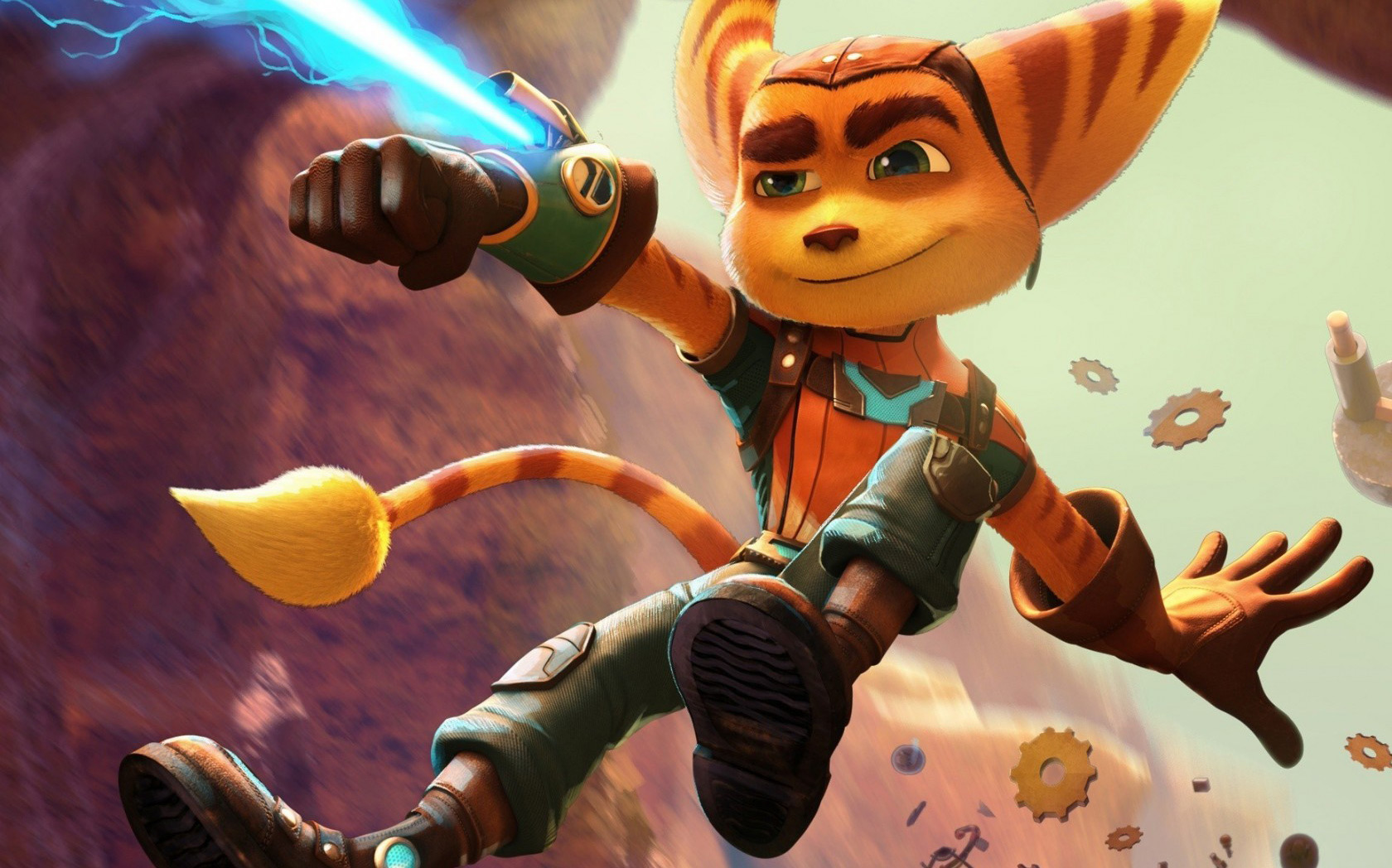 Description: A cartoon character flying through the air with a light saber in his hand and a cat on his arm.