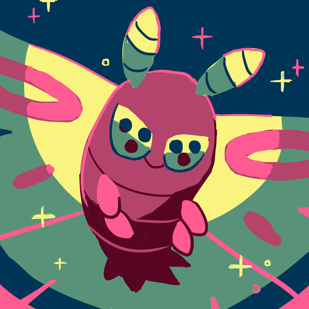 Description: A cartoon character flying through the air with a moon in the background and stars in the sky above it.