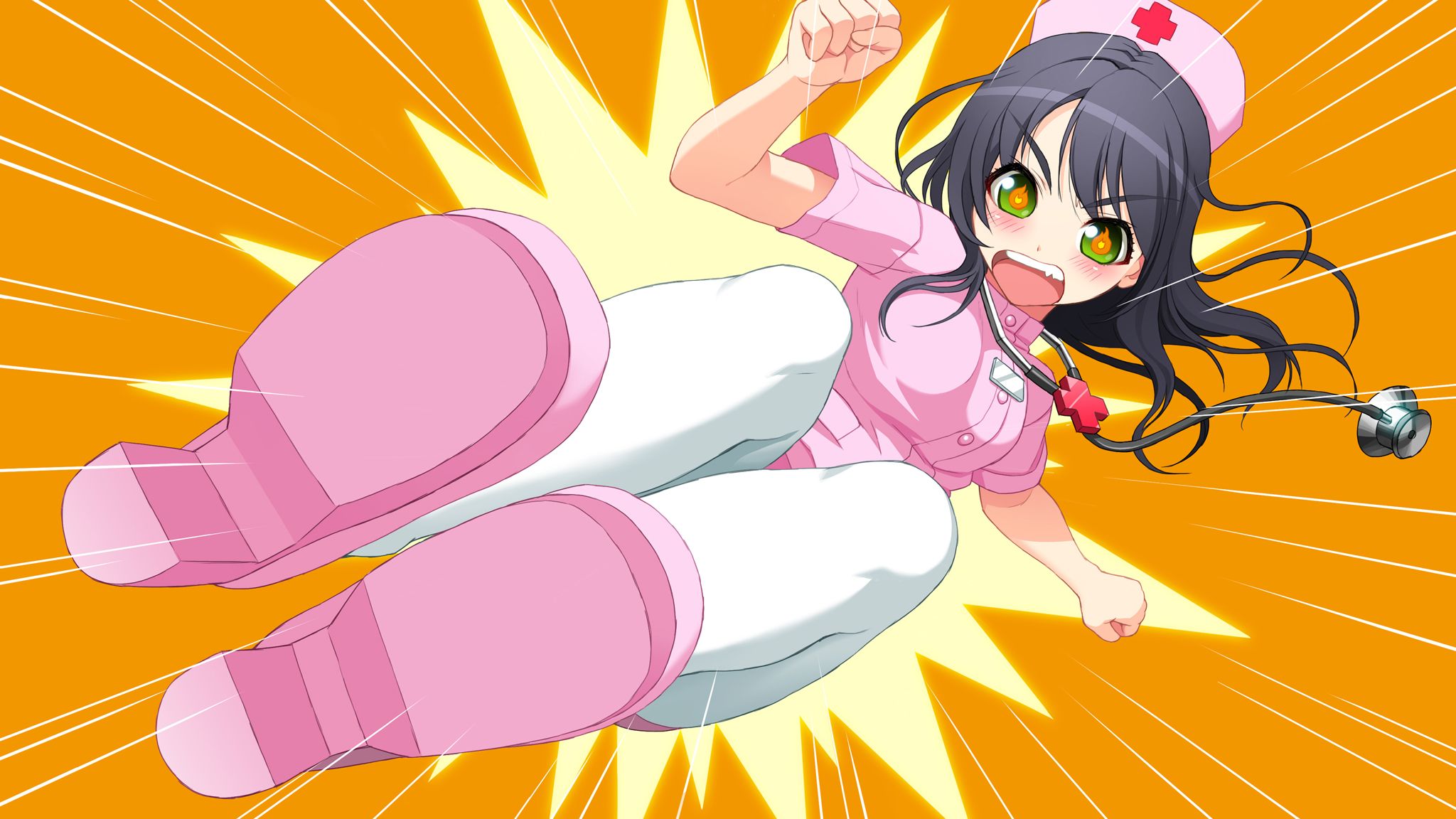 Description: A cartoon character is flying through the air with a pink hat on her head and a pink boot on her feet.