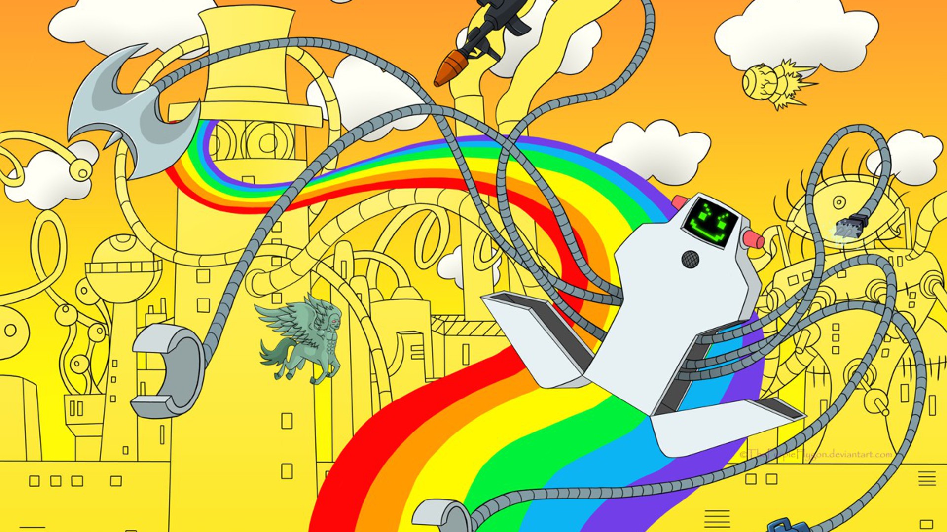 Description: A cartoon character flying through the air with a rainbow in the background and a roller coaster in the foreground.