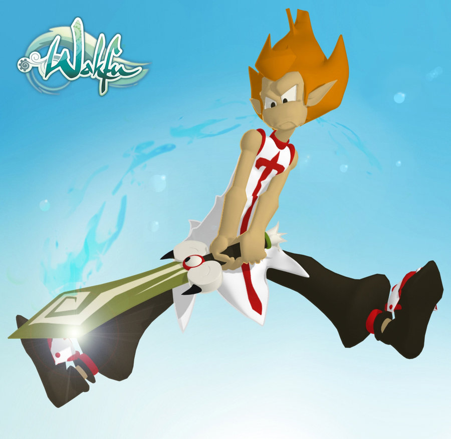 Description: A cartoon character flying through the air with a sword in his hand and a red and white shirt on.