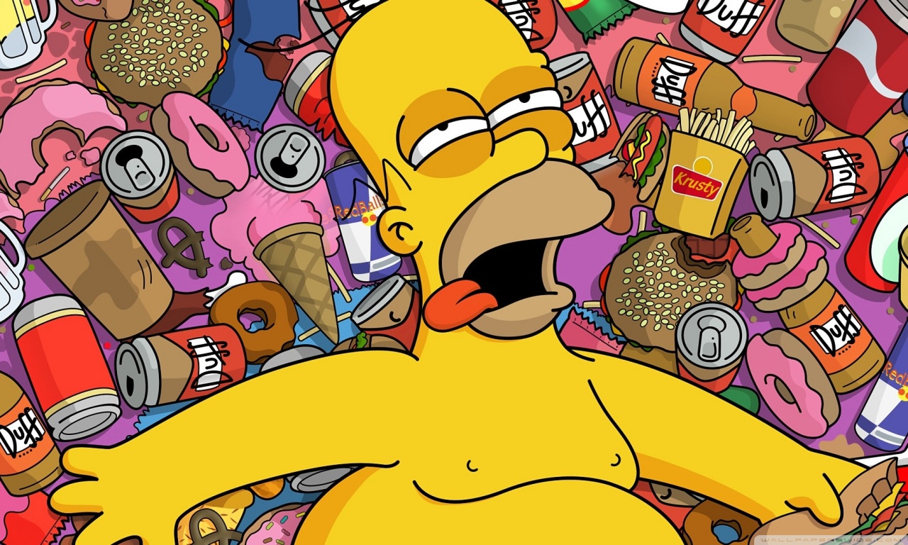 Description: A cartoon character with a lot of food around him and a lot of junk on the ground behind him.