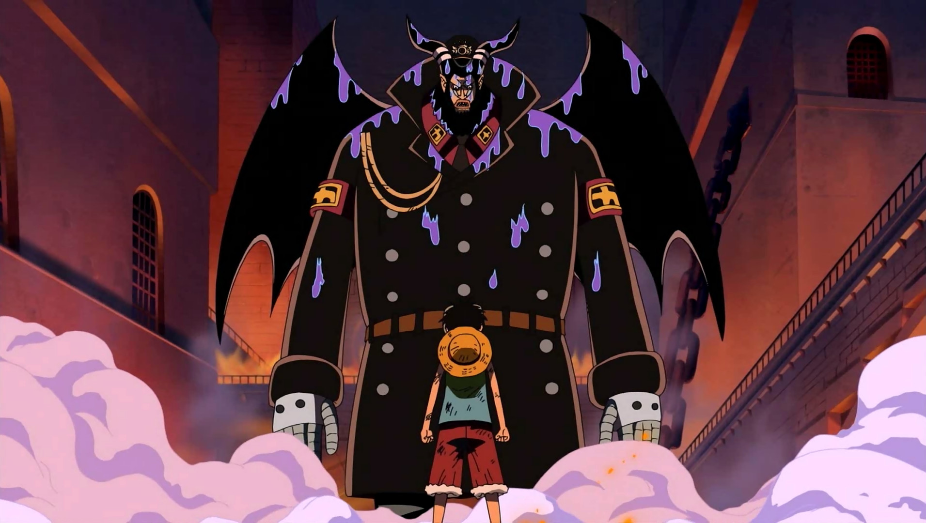 Description: A cartoon character standing in front of a giant demon with a woman standing next to him in a castle.