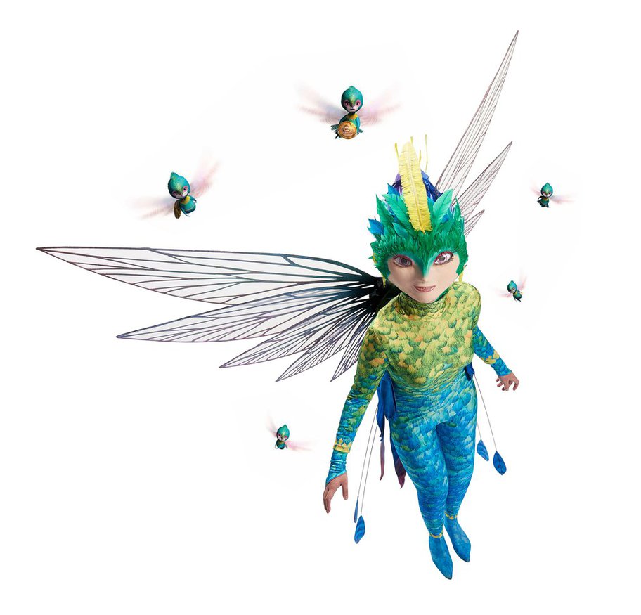 Description: A cartoon character with green hair and blue wings flying through the air with other flying insects around him and a white background.