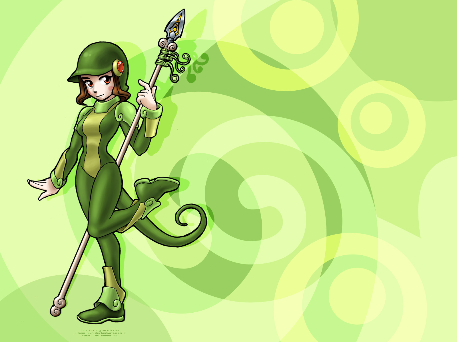 Description: A cartoon character holding a green and yellow stick and a green hat and green dress with a green swirl background.