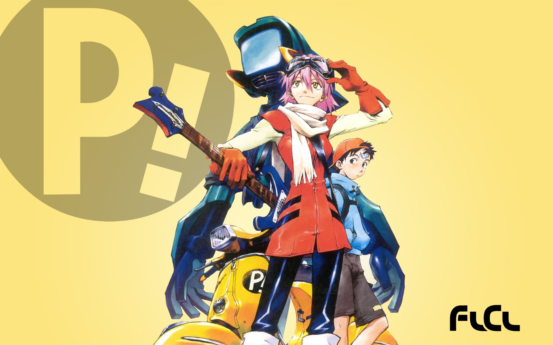 Description: A cartoon character with a guitar and a hat on his head and a yellow background with a black and white logo.