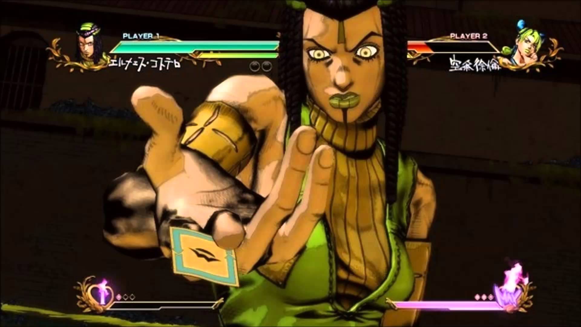 Description: A cartoon character is holding a hand up in a video game screen shot with a background of a building.