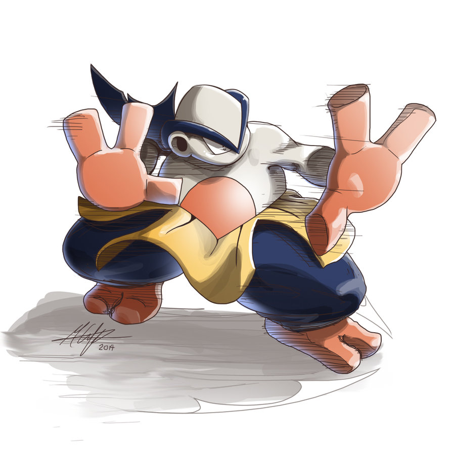 Description: A cartoon character doing a hand stand on one leg and one foot up in the air with one hand.
