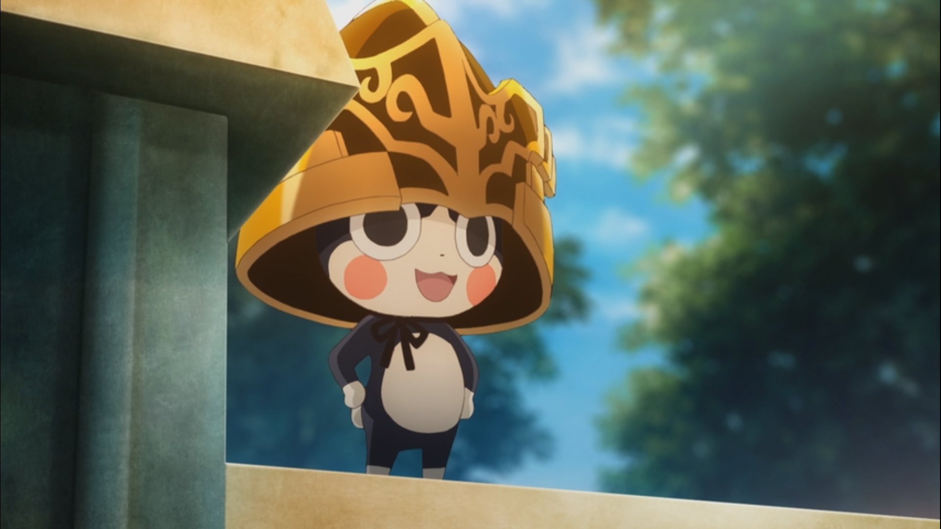 Description: A cartoon character wearing a hat and a black and white outfit with a large smile on her face and a tree in the background.