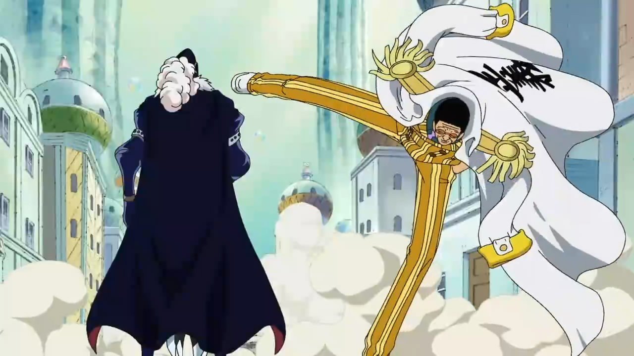 Description: A cartoon character is holding a giant object in the air with another character in the background and a city in the background.
