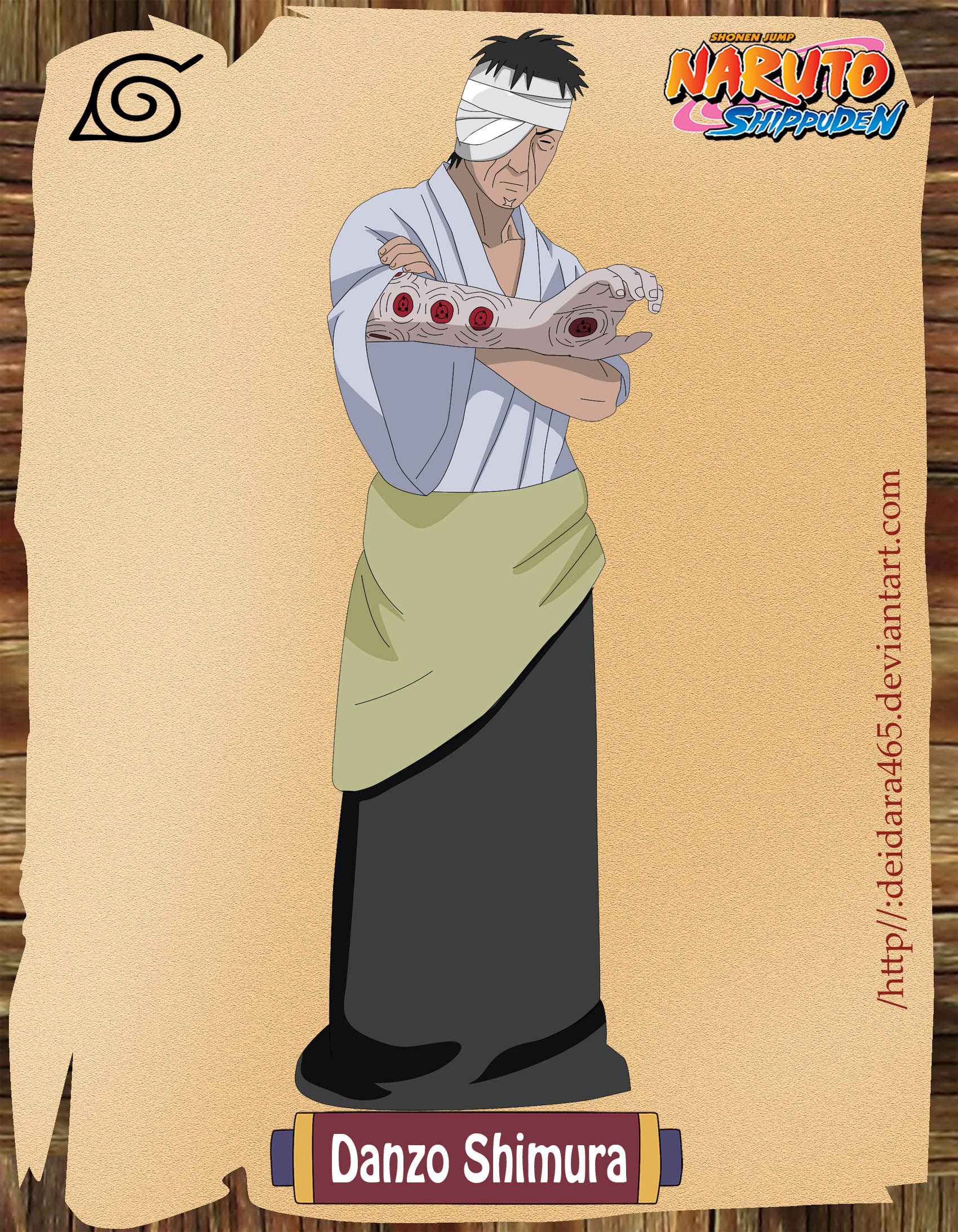 Description: A cartoon character holding a knife in his hand and a piece of paper in his other hand with the word naruto on it.