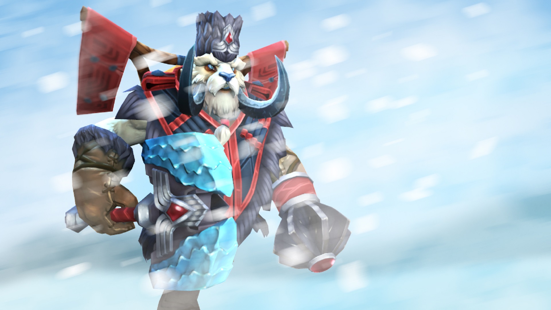 Description: A cartoon character is holding a large object in his hand and walking through the snow with a sword in his hand.