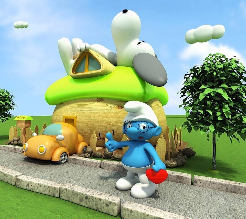 Description: A cartoon character is standing in front of a house with a car and a car on the road next to it.