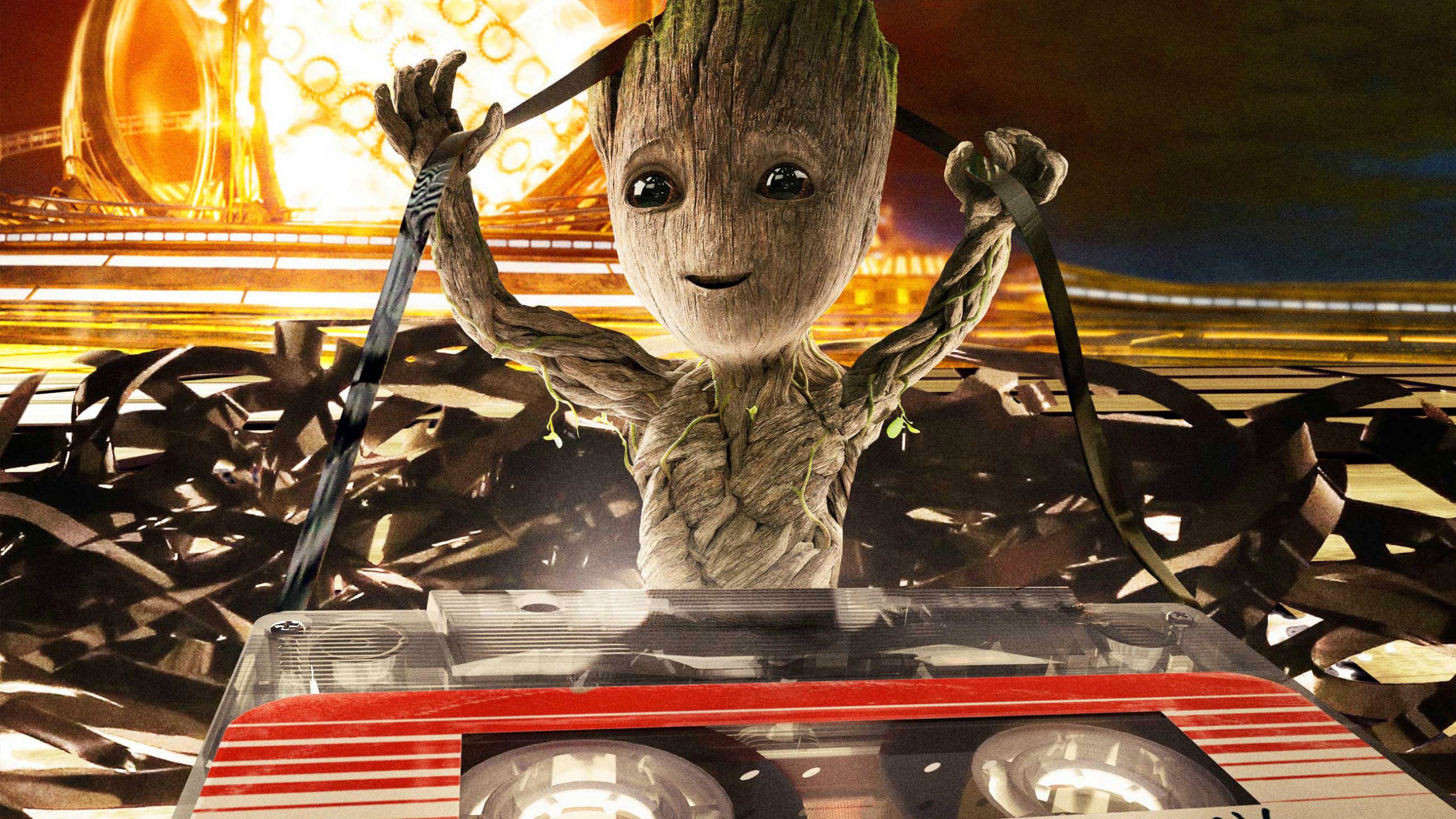 Description: A cartoon character holding a microphone and a tape recorder in front of a fire background with leaves and a star wars theme.