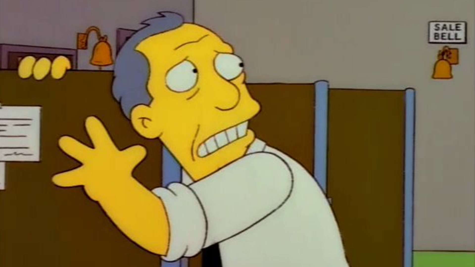 Description: A cartoon character pointing at a bulletin board with a hand gesture in front of him and a bell in the background.
