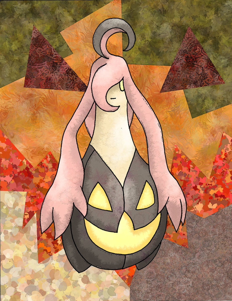 Description: A painting of a cartoon character holding a pumpkin in its hands and a background of leaves and a star.