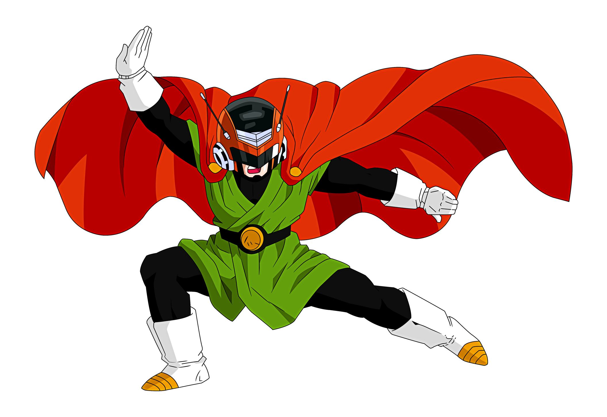 Description: A cartoon character with a red cape and green outfit and yellow shoes.