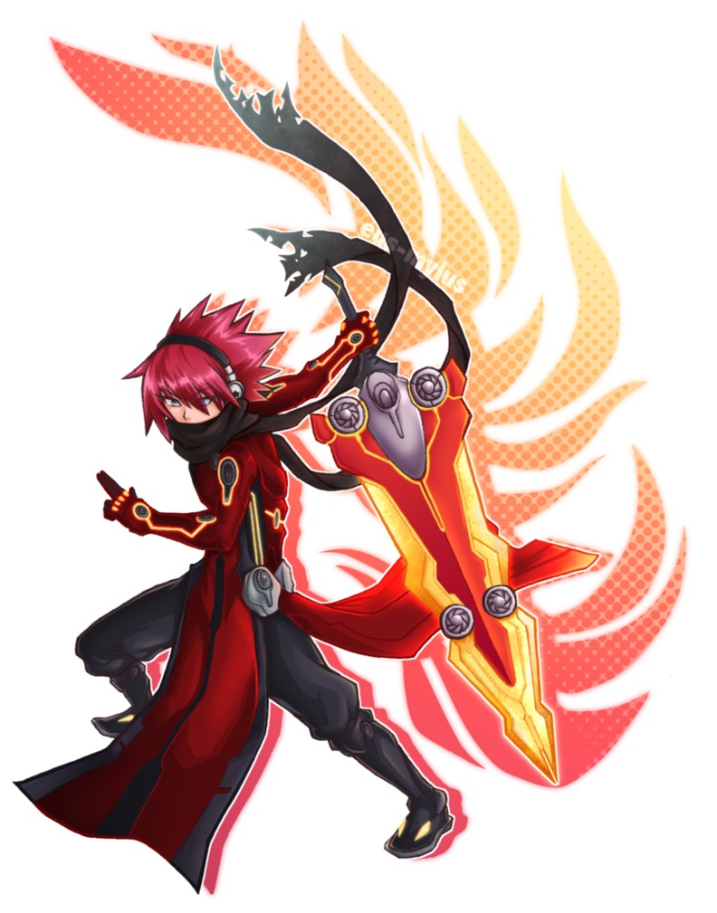 Description: A cartoon character with a red coat and a sword in his hand and a flame behind him.