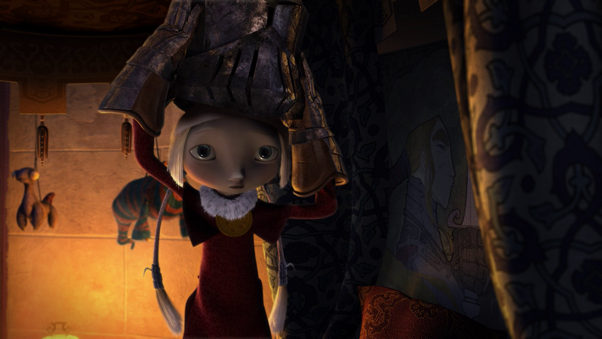 Description: A cartoon character is standing in a room with a lamp on the floor and a curtain behind her.