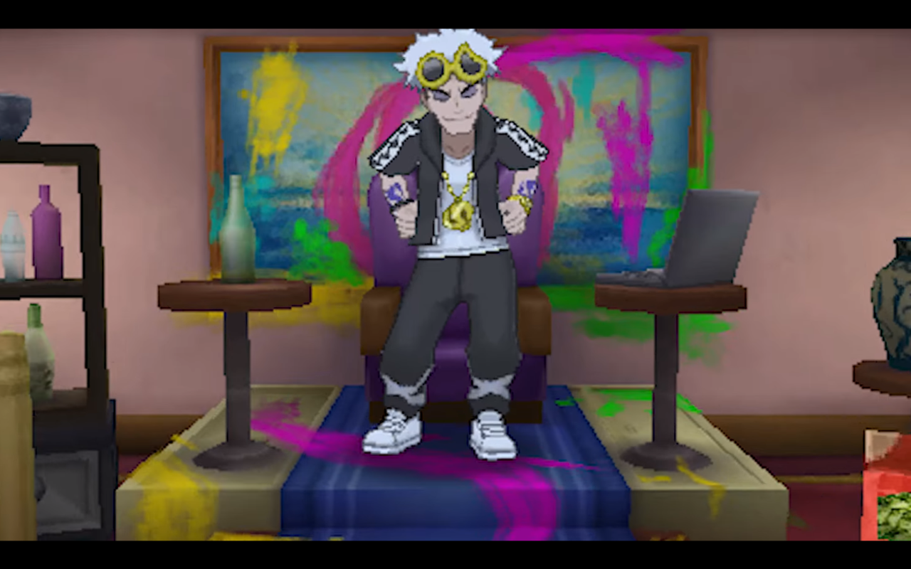 Description: A cartoon character is standing in a room with a painting on the wall behind him and a laptop on the table.