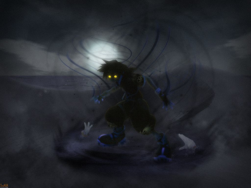Description: A cartoon character running in the dark with a full moon in the background and a foggy sky behind.
