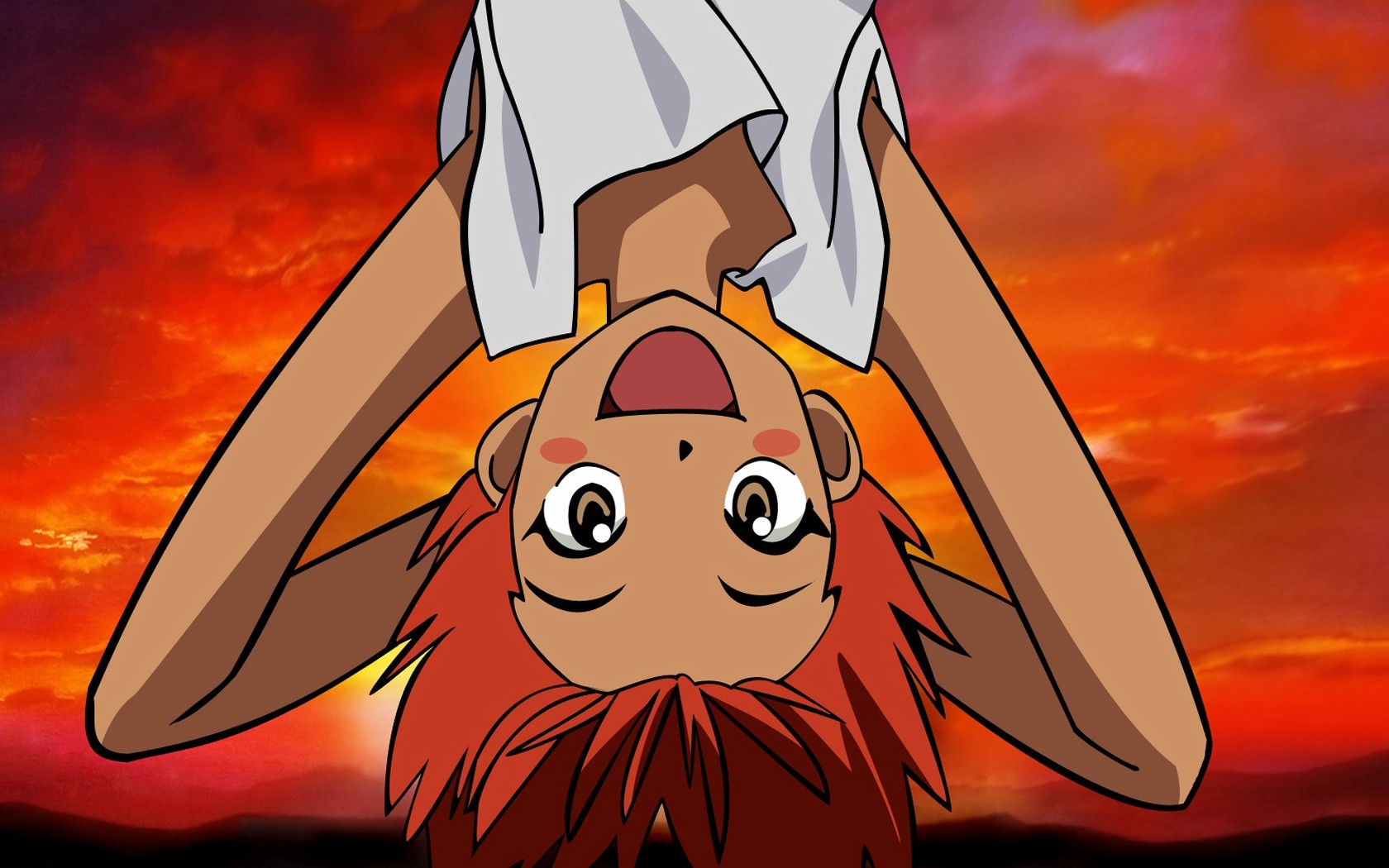 Description: A cartoon character holding a shirt over his head with a sunset in the background behind him and a red sky.