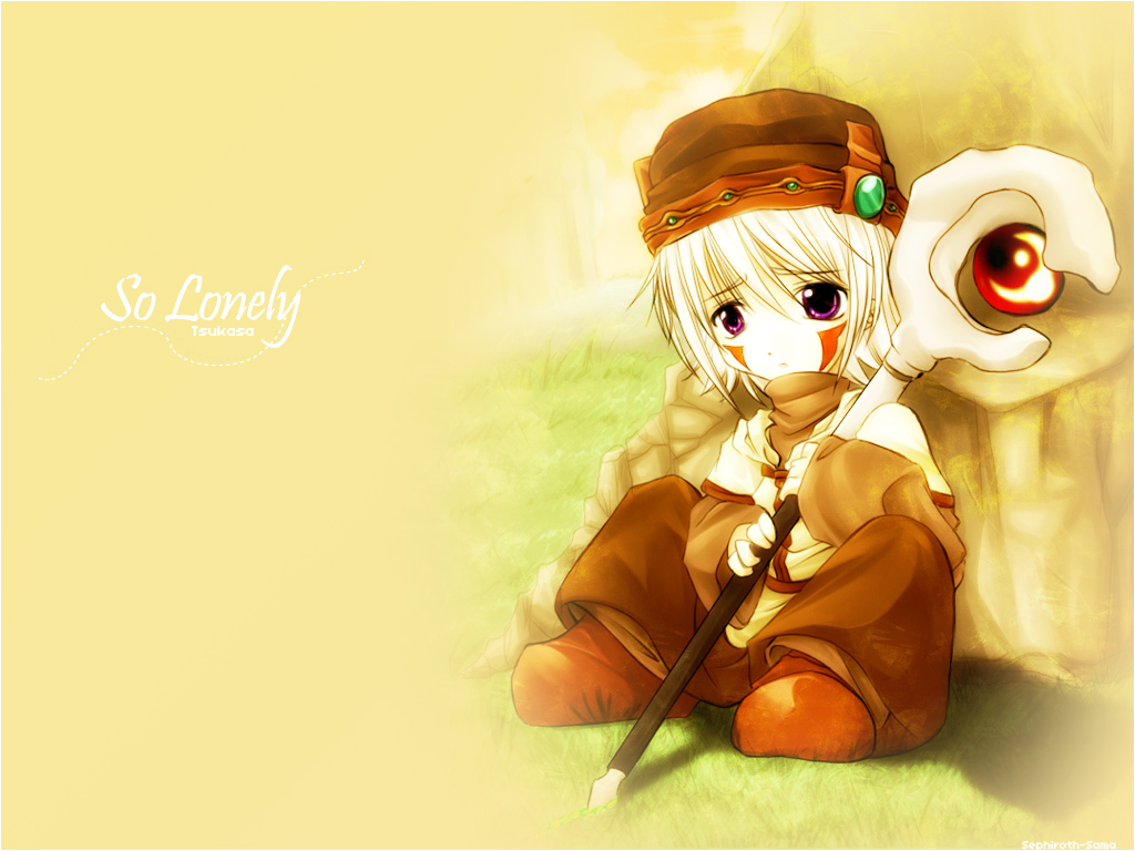 Description: A cartoon character sitting on the ground with a sword in hand and a hat on his head.