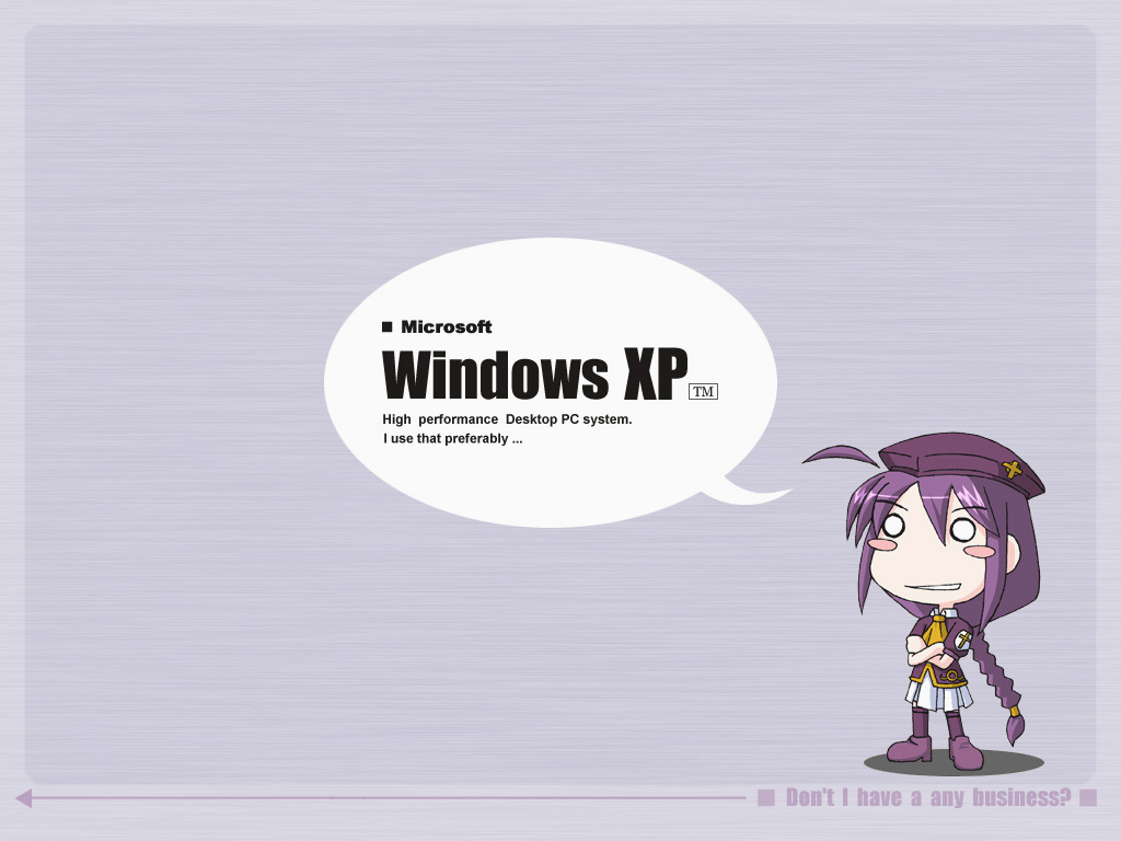 Description: A cartoon character with a speech bubble above it that says windows xp on it's side.
