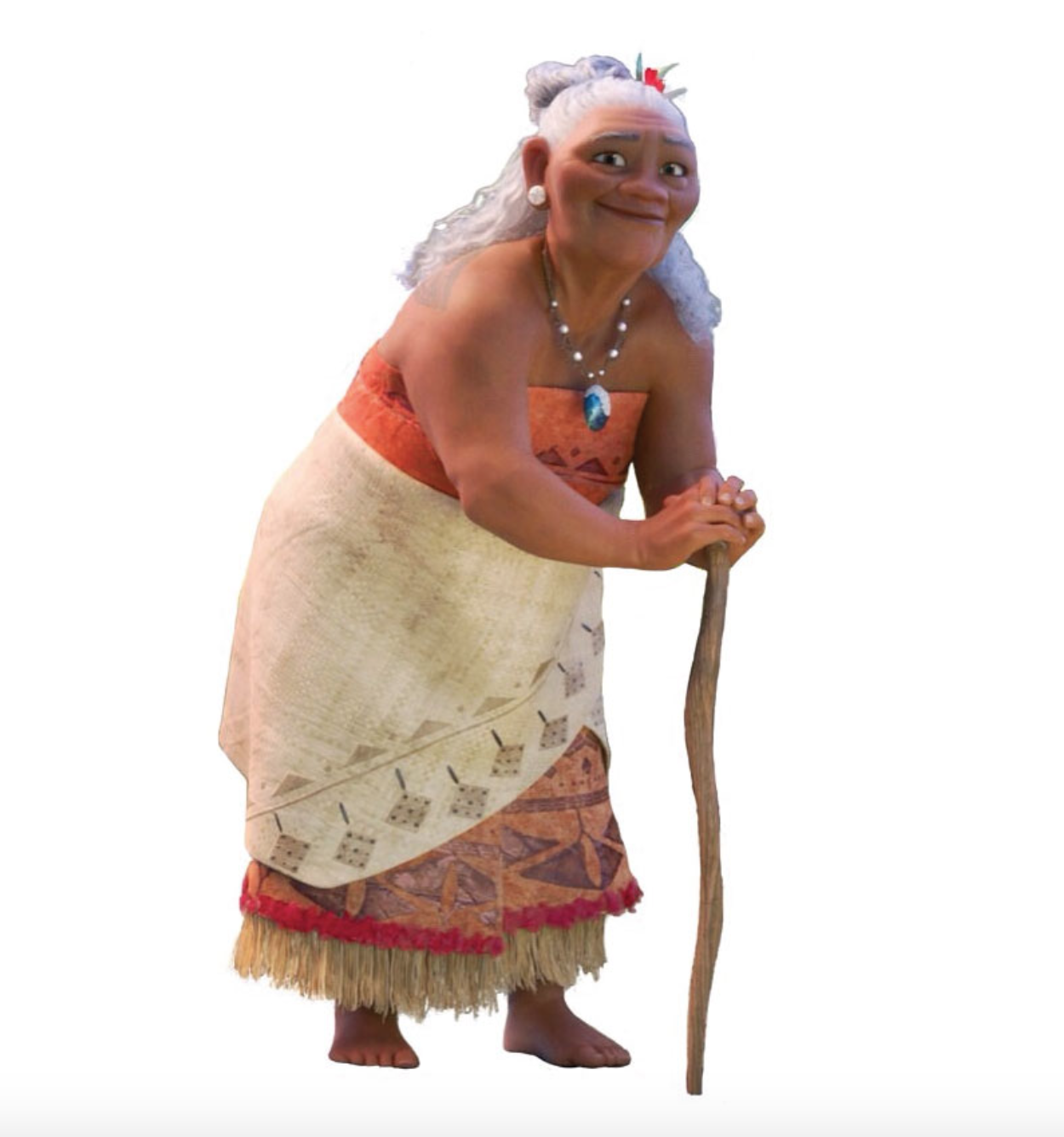 Description: A cartoon character is holding a stick and wearing a skirt and necklace with a feathered skirt on it.