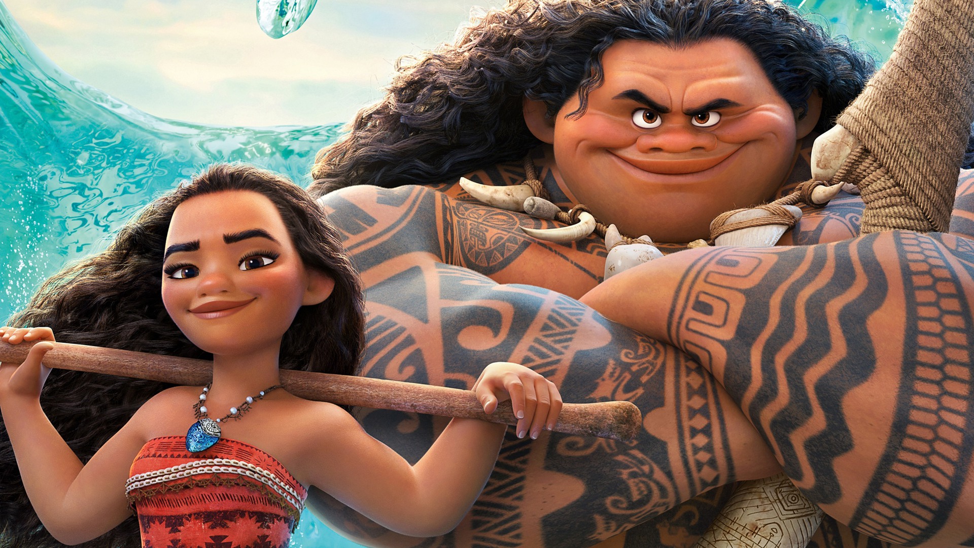 Description: A cartoon character holding a stick next to a woman in a bikini and a man in a tiki suit.