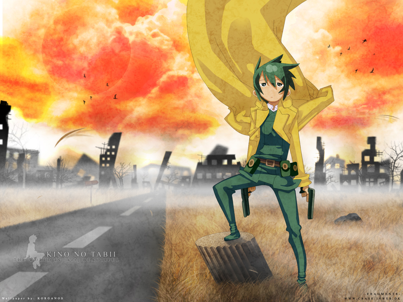 Description: A cartoon character is standing on a suitcase in the middle of a field with a city in the background.