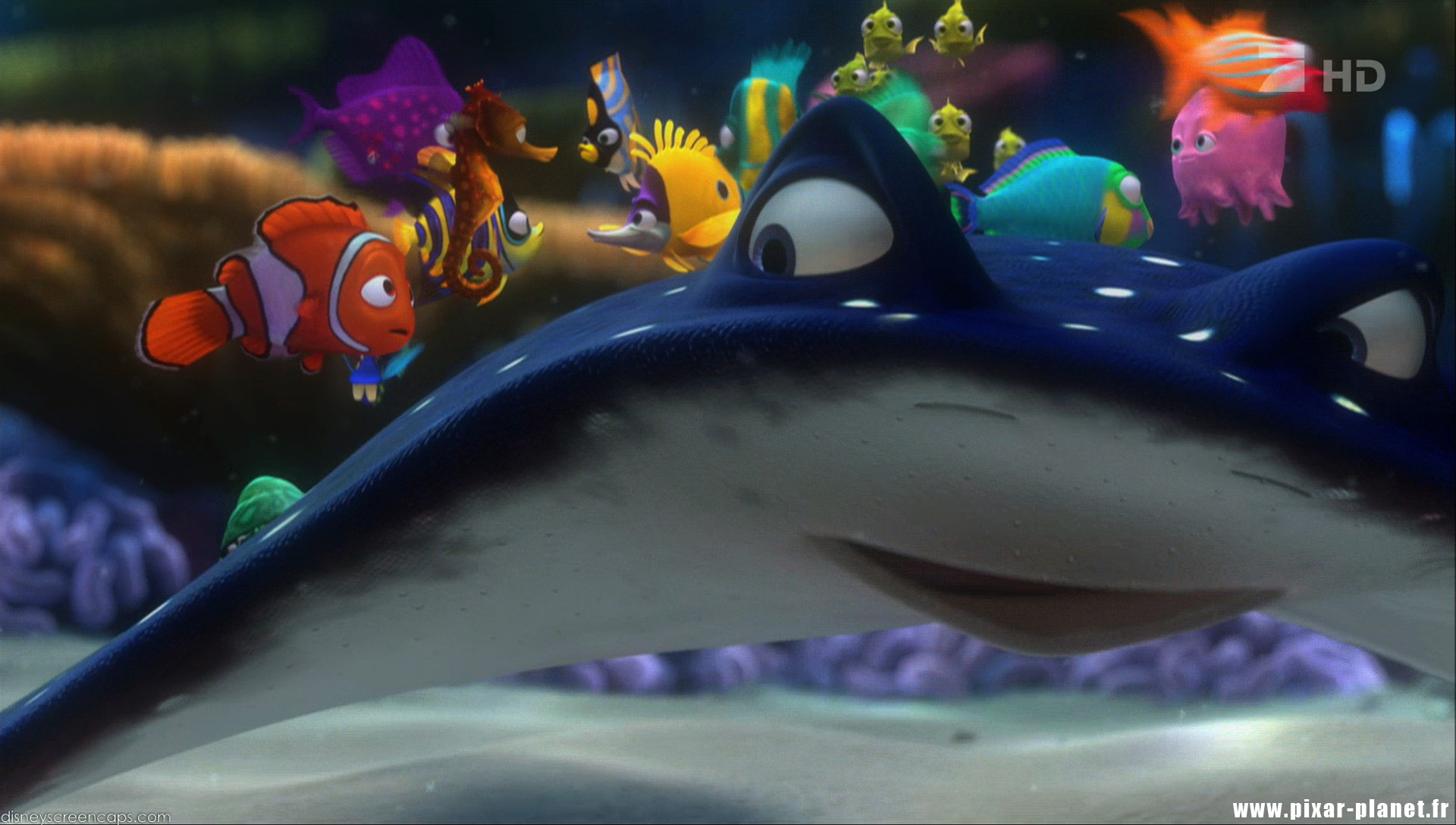 Description: A cartoon character is surrounded by fish in a sea of water with a fish in the background and a fish in the foreground.