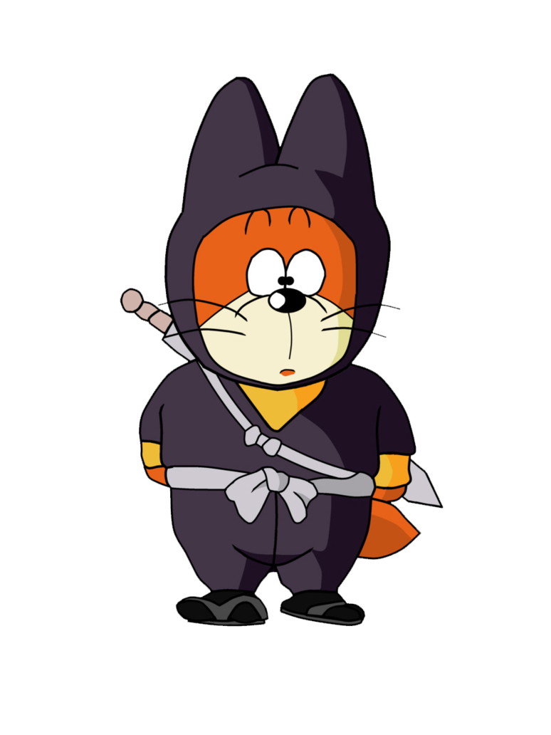 Description: A cartoon character with a sword in his hand and a black background with a red and orange cat on it.