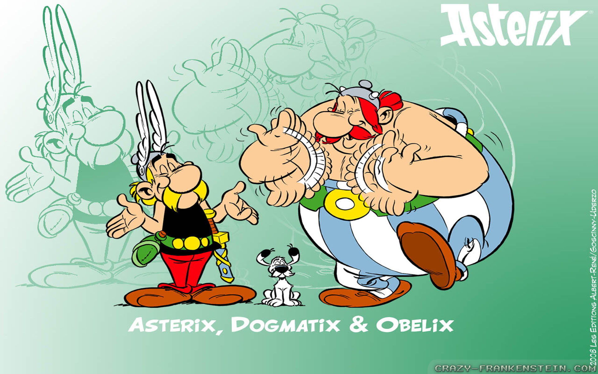Description: A cartoon character holding a sword next to another character with a dog on his back and a dog on his shoulder.