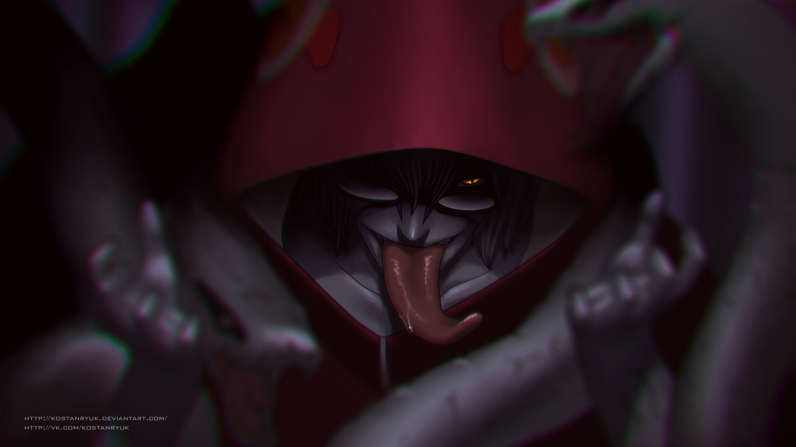 Description: A cartoon character with a tongue sticking out of his mouth and a hood on his head and hands around him.