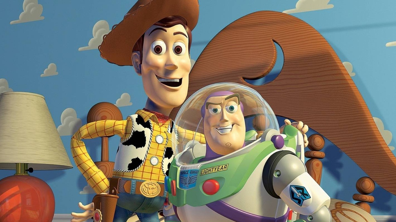 Description: A cartoon character is standing next to a toy horse and lamp in a room with a blue wall and a wooden floor.