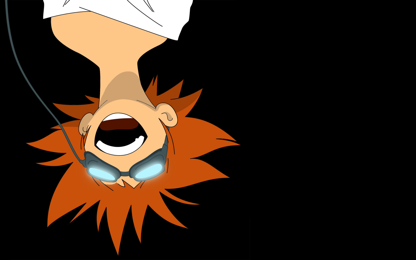 Description: A cartoon character is hanging upside down on a string with a fish in his mouth and a fish in his mouth.