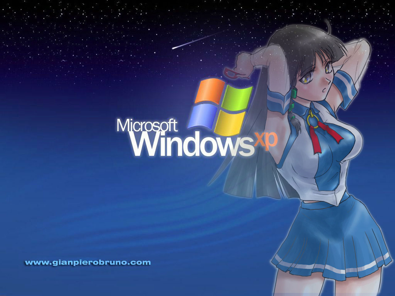 Description: A cartoon character holding a windows xp logo in her hand and a blue background with stars and a blue sky.